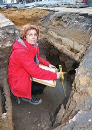 Dr. Karin Streiwe aus dem Team von Stadtarchäologin Sabine Sauer am mittelalterlichen Abwasserkanal