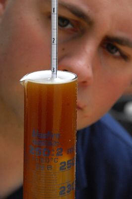 Damit wird im Wesentlichen bezeichnet, wo im Kessel die Hefe ihre Arbeit tut. Aber bis die ins Spiel kommt, hat Gossen schon viele Arbeitsschritte hinter sich. Immer wieder "spindeln": Mehrmals innerhalb des Brau- und Gärvorgangs muss Marcel Gossen den Zuckergehalt im Bier messen.