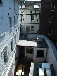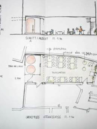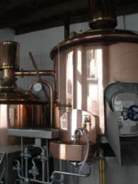 Sudhaus im Brauhof (Anbau neu) Fabr. Kuchenbaucher & Schüll. Für ~11 hl Ausschlagmenge pro Sud Dampfbeheizt, in Edelstahl, jeweils frei stehend auf viereckigen Edelstahlrahmen, mit bombierten formschönen Kupferhauben, Kupfertürchen, Schlöte und Kupferverkleideter Zarge, hochglanzpoliert und handwerklich perfekt verarbeitet.