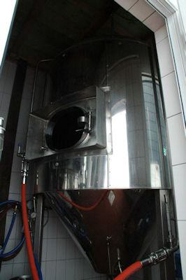 In großen 2300l fassenden Kombigärtanks wird die Würze mit Hefe versetzt, die sofort die Gärung auslöst. Sie wandelt den Zucker in Alkohol und Kohlensäure um.