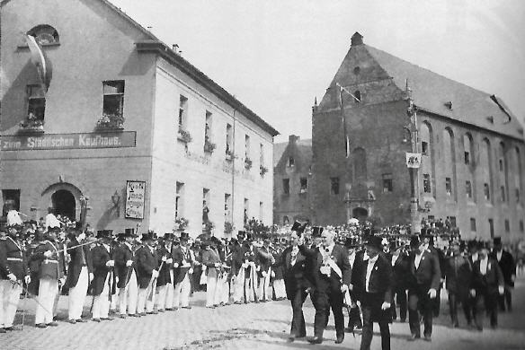 1907 Das historische Kaufhaus, mehrfach umgebaut zur Feier und Versammlungsstätte der Schützen, deren Obergeschoss schon im Mittelalter als sogenannter Schützensöller diente.