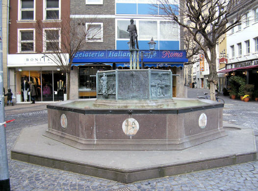 Dieser Brunnen ist eine Stiftung der Stadtsparkasse Neuss, aus Anlass der 2000 Jahrfeier der Stadt. In der Schale des Brunnen steht ein Oktogon und dieses ist belegt mit Bronzereliefs. Diese zeigen uns die Geschichte der Stadt.
