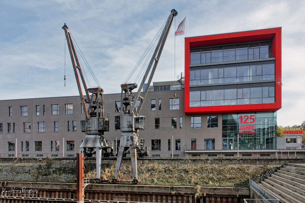 Sie stammen aus den 1950er Jahren, sind längst nicht mehr in Betrieb – spiegeln dafür aber Industriegeschichte der deutschen Nachkriegszeit wider: die alten Frachtkräne am Neusser Hafen.