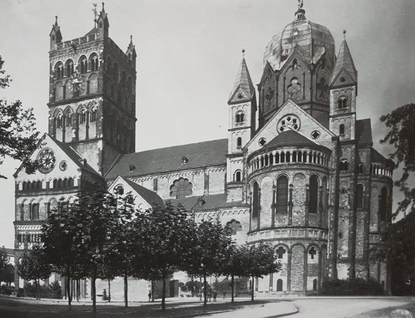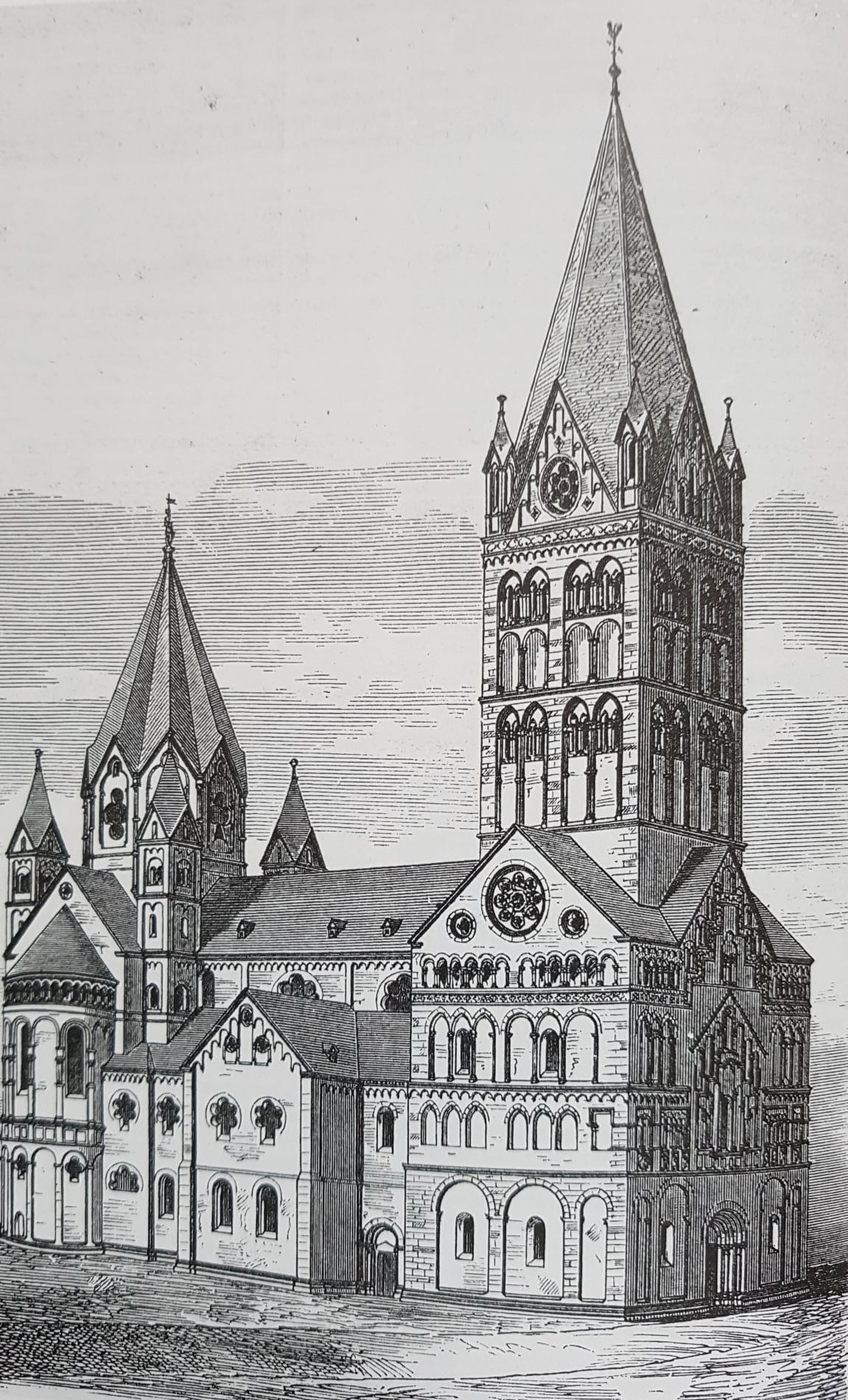 Der Westturm hatte vier Ecktürmchen und eine hohe Spitze, der Ostturm (Vierungsturm) ein Faltdach, 2 der 4 Ecktürme am Ostturm sind zu erkennen.