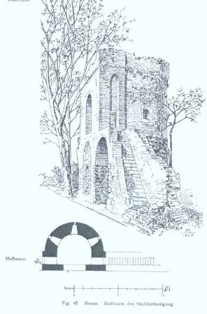 Der Halbturm (bis auf den Ende des 15. Jh. erbauten Aufsatz), die Pfeiler und die Bögen darüber gehören unzweifelhaft der Anlage Konrads von Hochstaden an sie stimmen mit den übrigen Resten und mit dem im 13. Jh. üblichen System ganz überein. die nur 62 cm starke eigentliche Aussenmauer bestand an dieser Stelle offenbar aber schon vorher, die Pfeiler und der Turm sind nicht in sie eingebunden, sie zeigt innen und außen Tuffverblendung in der gewöhnlichen Tuffziegelgrösse, dazwischen ein Gussmauerfüllwerk mit einzelnen Brocken von römischen Ziegeln. C. KOENEN erblickt in ihr Reste der Ummauerung des Kaisers Julian.