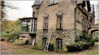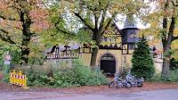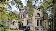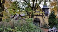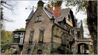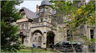 Auffallend ist die offene Eingangshalle mit Balkon, Türmchen und Erker in historischen Schmuckformen verzieren das Hauptgebäude.