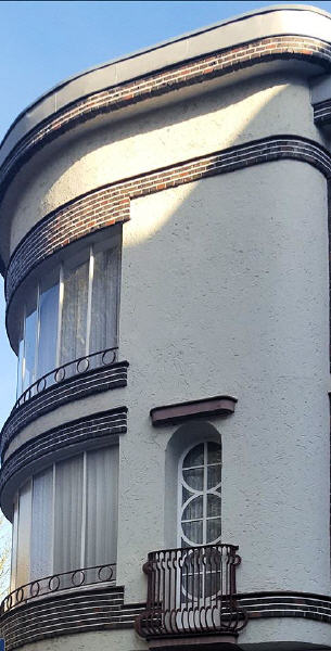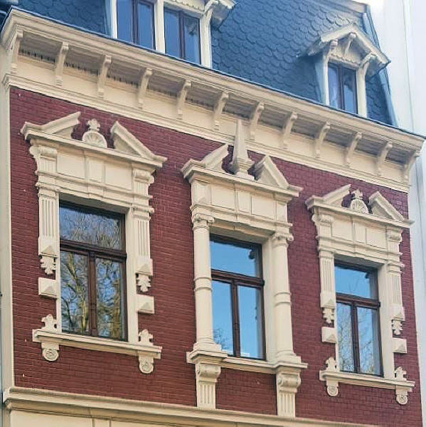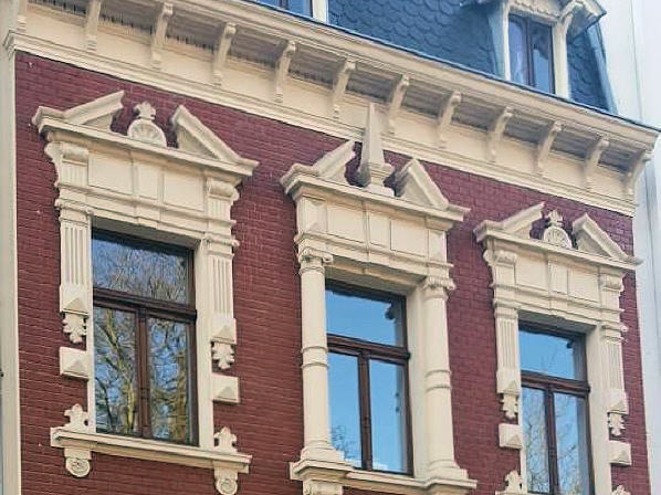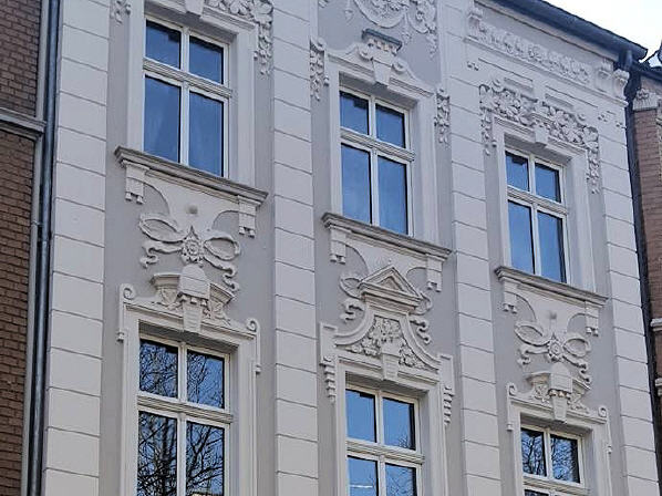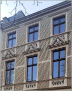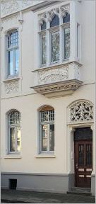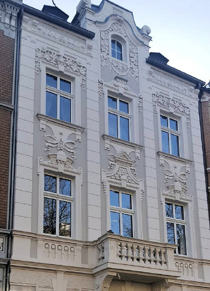 An dieser Häuserfront sehr gut zu erkennen ist, der Jugendstil. Grundlage für die Ornamentik des Jugendstils sind einerseits fernöstliche, anderseits aus der Volkskunst entnommene Pflanzen und Tiermotive, die überwiegend auf dem Wasser angesiedelt sind. Schwäne, Kraniche, Lotosblumen und Seerosen, aber auch die Mistel und die Mohnblume, um nur einige Beispiele zu nennen.