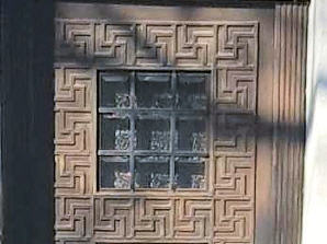 Als dieses Haus 1913 erbaut wurde, war von dem Hakenkreuz als nationalsozialistisches Zeichen noch gar keine Rede. Die glatt gerahmte Tür darunter ist mit engen Quadratfeldern erhaben gerastert und mit Swastika ornamentiert.