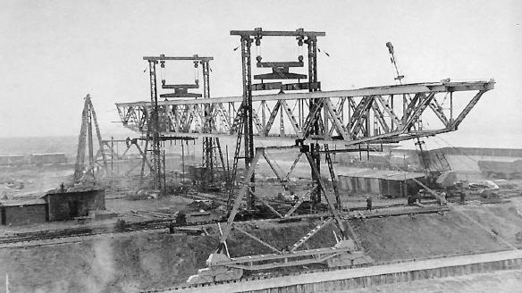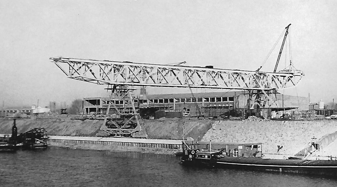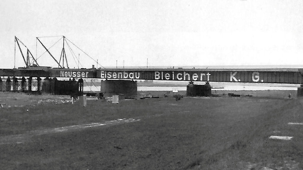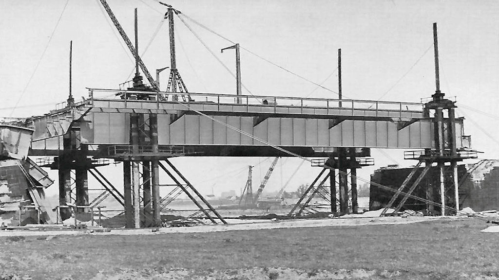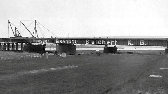 Wiederherstellung der 1945 zerstörten Flutbrücken über den Rhein Düsseldorf und Neuss.