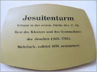 Der Jesuitenturm ist ein achtseitiger, dreigeschossiger Turm mit geschweifter Haube und durchbrochener Wetterfahne.