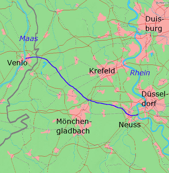 Da es jedoch an der Erftmündung bereits einen Naturhafen gab und so keine Grundeigentümer entschädigt werden mussten, und die Neusser Geschäftsleute einen Bittbrief an Napoléon geschickt hatten, sie versprachen sich wirtschaftlichen Aufschwung durch den Kanal wurde die Strecke von Grimlinghausen (heute ein Stadtteil von Neuss) über Neuss, Holzbüttgen, Schiefbahn, Neersen, Broich, Süchteln, Grefrath, Krickenbeck, Herongen, Straelen bis nach Venlo gelegt.