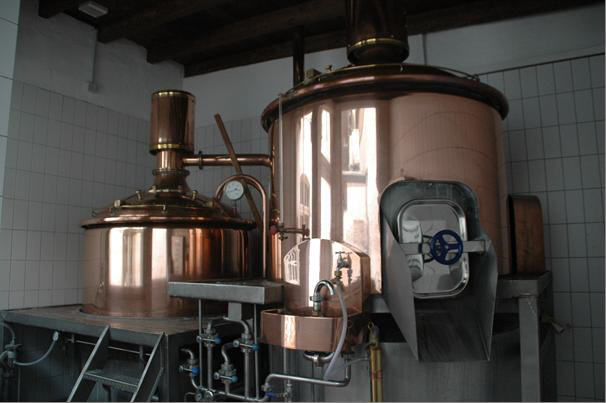 Die abgeläuterte Würze fließt nun in die Kupfer-Sudpfanne, wo sie 1-11/2 Stunden unter Beigabe von sehr feinem Hallertauer Aromahopfen gekocht wird. Dieser gibt den unvergleichlichen und angenehm herben Geschmack und das charakteristisch feine Aroma. Der Hopfen fördert auch die Haltbarkeit.
