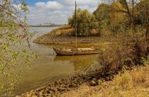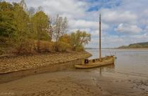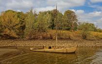 Auf Höhe der Rhein-Einmündung zum Silbersee wartet in diesen Tagen ein für viele unerwarteter Hingucker: Das Wrack des alten Aalschokkers, der in den 1990er Jahren unterging und seitdem weitgehend vom Fluss verschluckt worden war, ist aufgrund des Niedrigwassers im August 2022 wieder vollständig aufgetaucht.