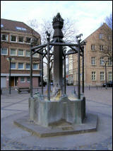 Einige Meter links vom Portal finden wir eine Bodenplatte mit der Inschrift „Quirinuspütz“ dort stand einst ein Brunnen aus dem das Tauf und Messwasser gewonnen wurde.
