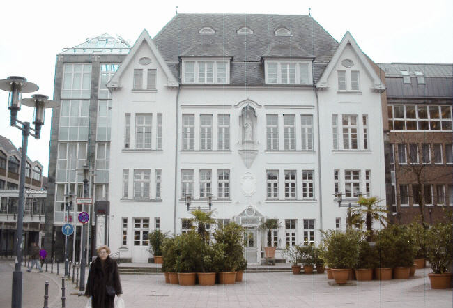 Dieses Haus, heute im Besitz der Sparkasse, war einst das Wohnhaus und die Wäscherei des Herz-Jesu Krankenhaus. Das Krankenhaus war das daneben stehende rote Backsteingebäude. Nachdem die Augustinerinnen die das Krankenhaus unterhielten, auf der Furth das nach Ihrer Gründerin genannte Johanna Etienne Krankenhaus eröffnet hatten, wurde das Herz-Jesu in ein Altenheim umgewandelt. Nach einigen Jahren bauten die Augustinerinnen am Konvent ein neues Altenheim und nach dem Umzug ins neue Haus wurde das Gebäude von der Stadtverwaltung übernommen und das Sozial und Jugendamt zogen ein.
