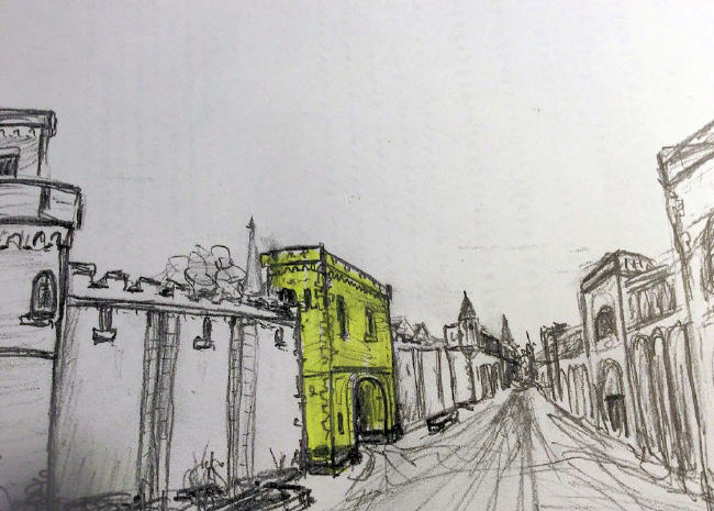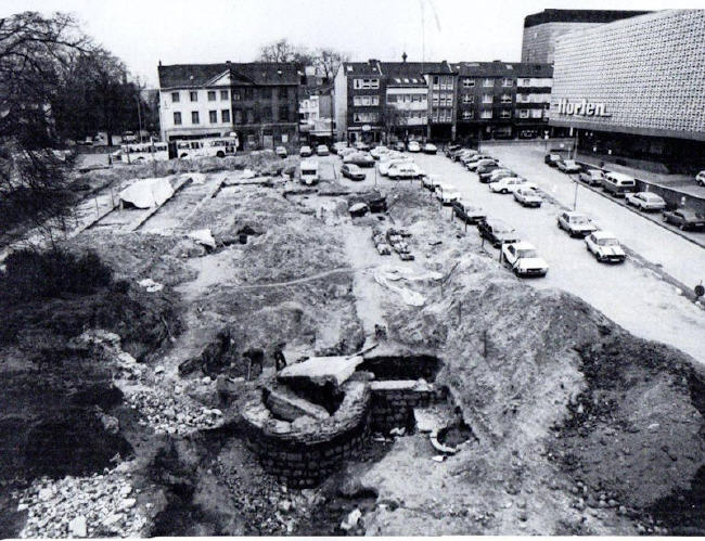 ![]() Auf diesem Bild gelb gemakert- links im Vordergrund der Turm, der in der AOK in der Tiefgarage, noch in den Grundmauern erhalten ist! |