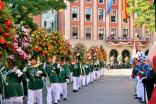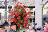 Auch heute kann man beim Schützenfest solche großen Hörner sehen; diese sind allerdings nicht mehr mit Bier, sondern mit aufwändigen Blumengestecken gefüllt.