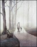 Der alte Mann geht mit seinem Hund weiter. Sie kommen an einen herunter getrampelten Zaun ohne Tor, lediglich mit einem Loch.