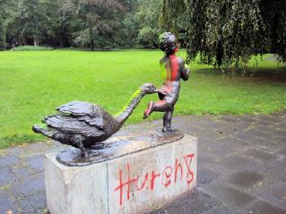 So steht die Bronzeplastik nun seit mehr als 65 Jahren dort, wo Oswald Causin auch zu dieser Arbeit inspiriert wurde. Während eines Spaziergangs durch den Stadtgarten hatte er nämlich einen kleinen Jungen beobachtet, der aus dem Nest eines am Stadtweiher brütenden Schwanenpaares ein Ei stiebitzt hatte und damit weglief.